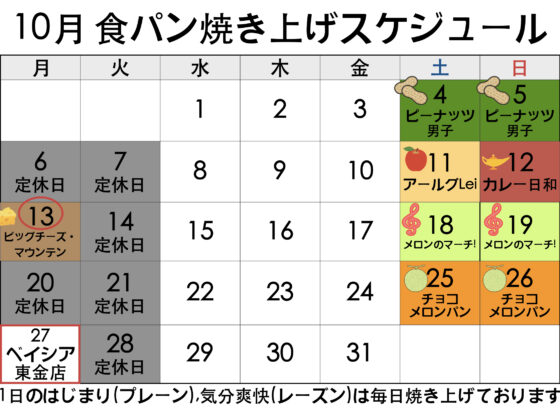 食パン焼き上げスケジュール、 月曜日の催事出店についてお知らせいたします。 …