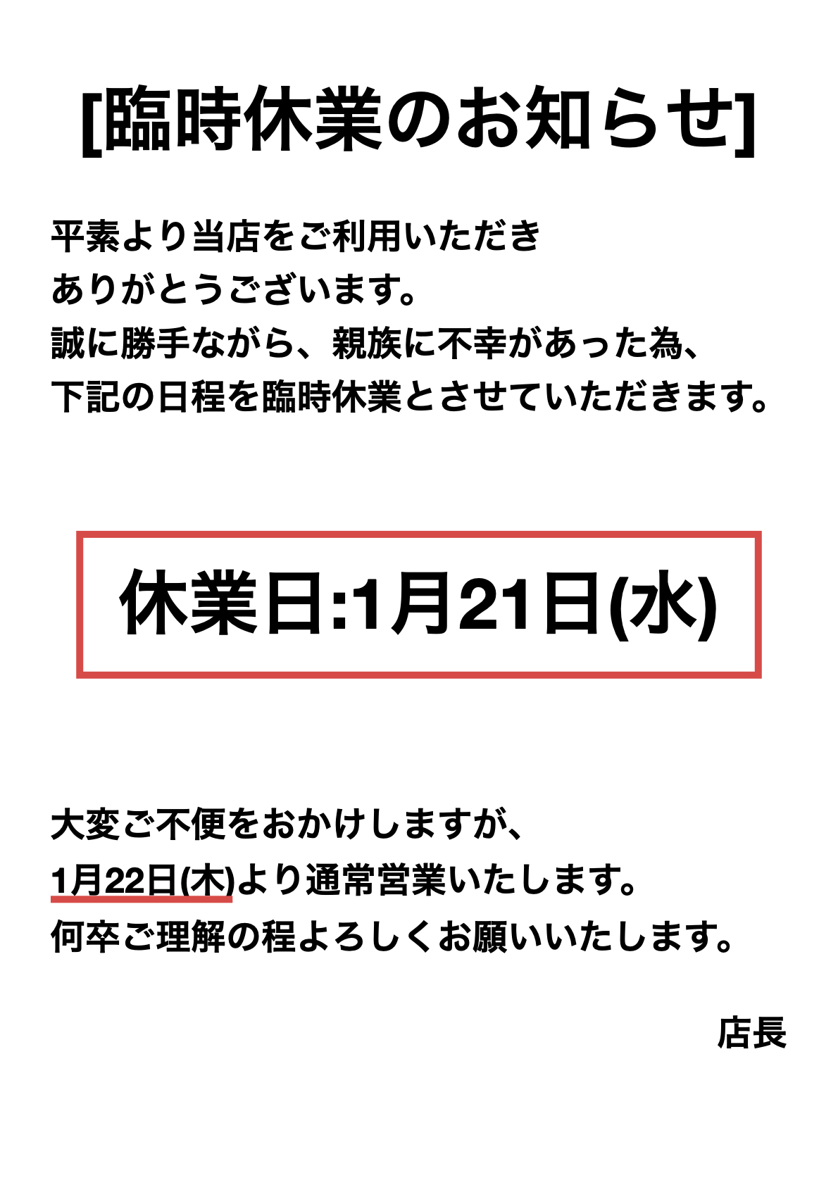 臨時休業のお知らせ